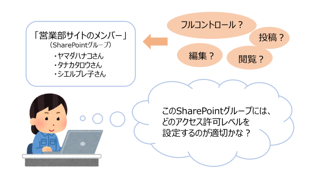 サイト管理者はサイト利用者として想定しているSharePointグループやセキュリティグループ、ユーザーに対し、利用方法に応じてアクセス許可レベルを設定する必要があります。