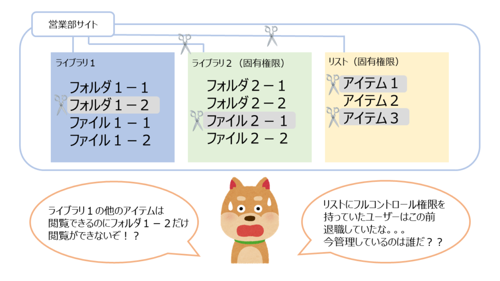 ライブラリのファイルやリストのアイテムといった小さい単位で固有権限を設定することもできますが、サイト管理者はどこに誰の権限があって、誰がアクセスできるのかというサイト全体の権限設定を把握できるのが好ましいです