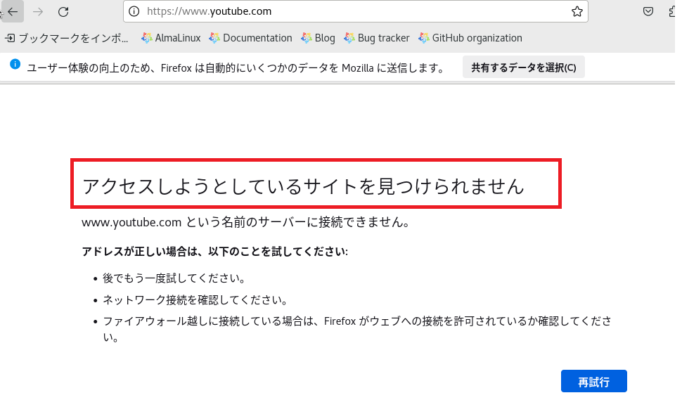 インターネットに接続できるか確認してみましたが、「アクセスしようとしているサイトを見つけられません」と表示され