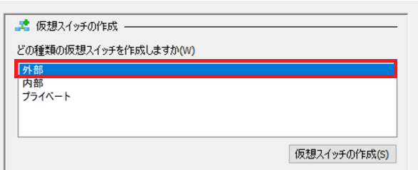 外部仮想スイッチを作成するため、「外部」を選択し、「仮想スイッチの作成」を押下します。