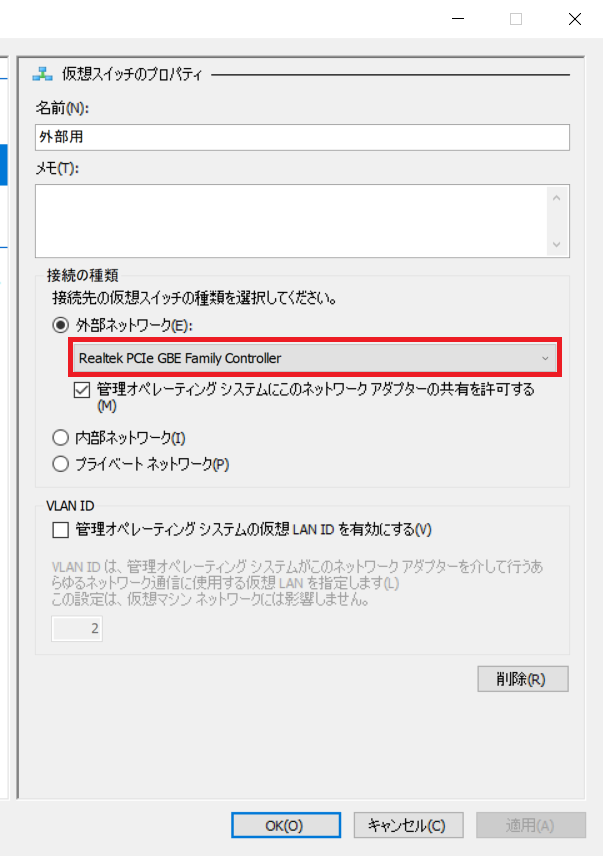 「仮想スイッチ(S):」の項目で作成した外部仮想スイッチが選択されていることを確認します。