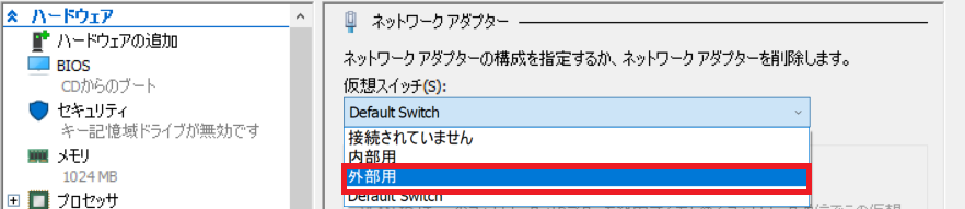 「仮想スイッチ(S):」の項目内で作成した外部仮想スイッチである「外部用」を選択します。