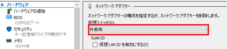 1-4.使用している仮想マシンに作成した外部仮想スイッチを割り当てる。