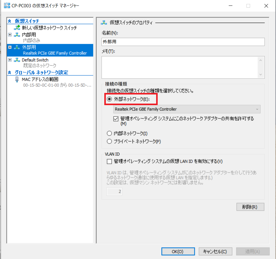 「仮想スイッチ(S):」の項目で作成した外部仮想スイッチが選択されていることを確認します。