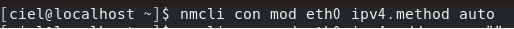 まず、IPアドレスの取得方法を固定取得にしていたため、「nmcli con mod eth0 ipv4.method auto」コマンドを実行し、自動取得に変更してみました。