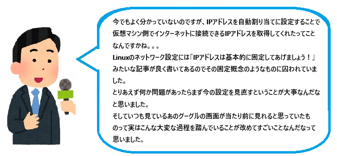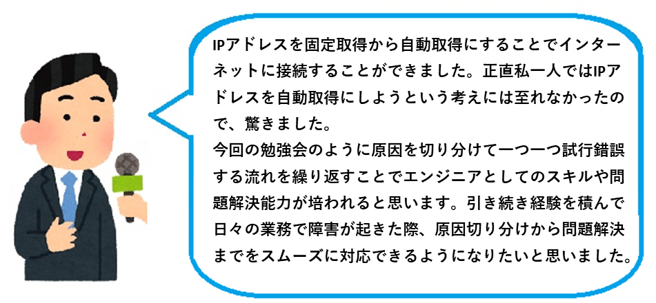 IPアドレスを静的→動的に戻すことでインターネットに接続できたことについて、私たちは理解しきれていない部分もあったのですが、無事接続できたので良かったということで一段落つきました。