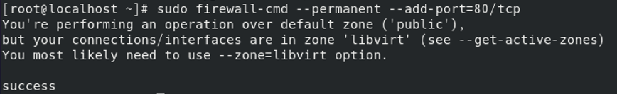HTTPのポート80を許可するために、rootユーザでログインして「sudo firewall-cmd --permanent --add-port=80/tcp」コマンドを実行しました。