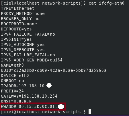 「cat /etc/sysconfig/network-scripts/ifcfg-eth0 」は「HWADDR」の部分でMACアドレスを確認できます。