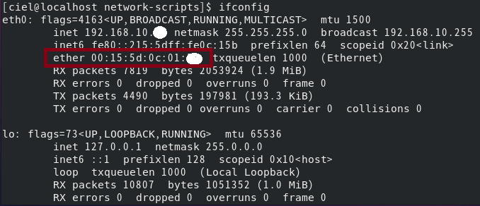 「ifconfig」はetherの部分でMACアドレスを確認できます。