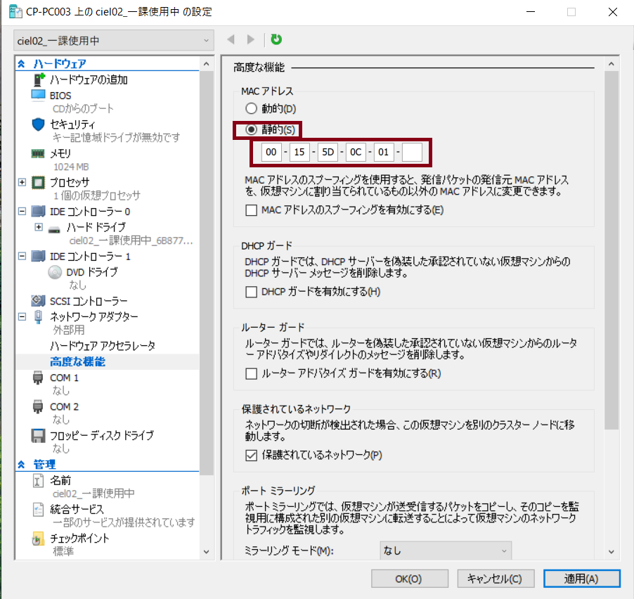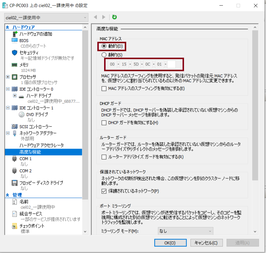 1.Hyper-Vの設定でMACアドレスを静的にする