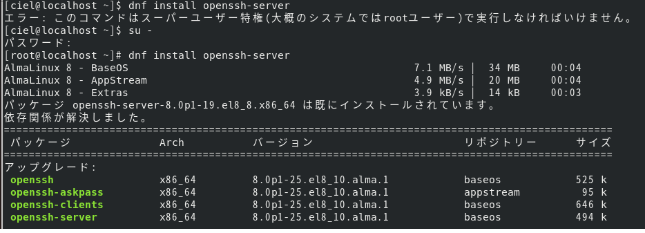 sshのインストールを先の項番で行ったため、「dnf list installed | grep -i openssh」コマンドでインストールされているか確認しました。