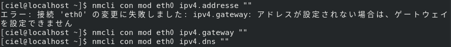 IPアドレスの値を初期化するコマンド:「nmcli con mod eth0 ipv4.addresse ""」
