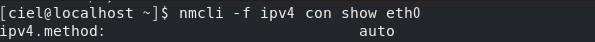 そのため、正常にIPアドレスを自動取得する設定が反映されているか、「nmcli -f ipv4 con show eth0」コマンドで確認しました。