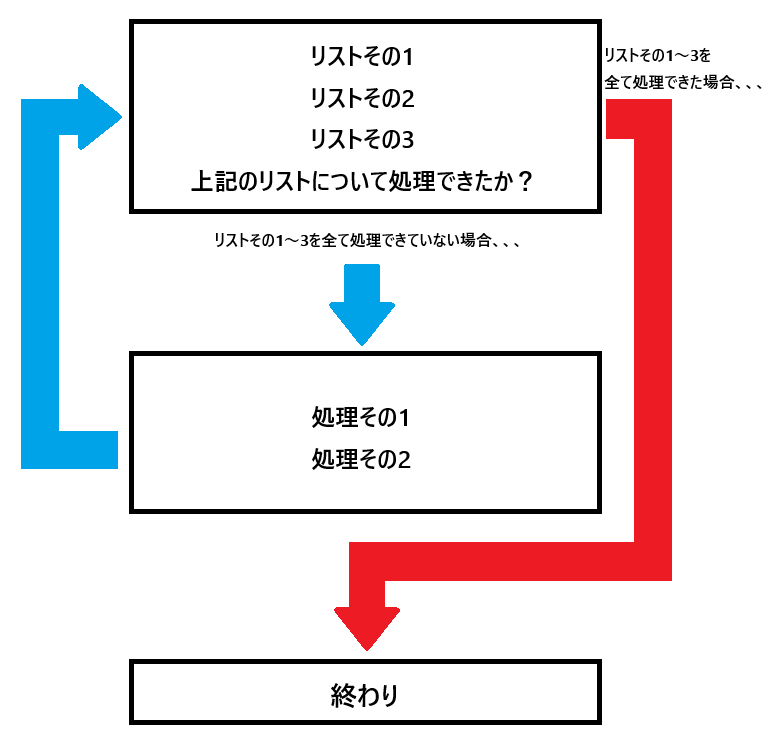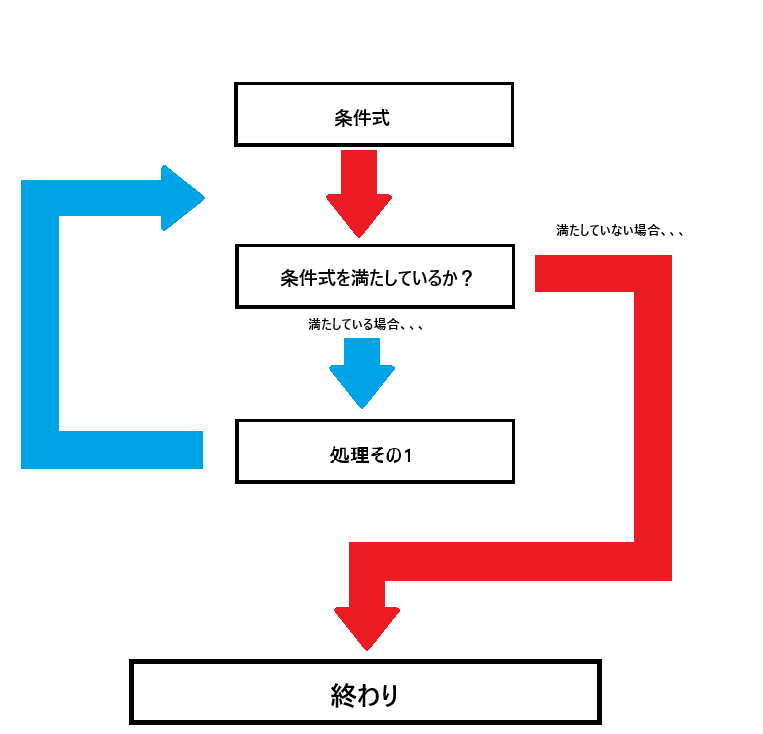 図を見てわかるように条件式を満たしている限り、青い矢印に進み、